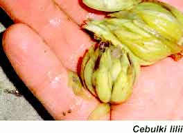 Cebule Lilium spectabile i lilii złotogłów L. martagon, suszone i zmielone były wraz z korzeniami łączenia baldaszkowatego Butomus umbellatus, pałki szerokolistnej Typha latifolia i krwiściągu większego Sanguisorba officinalis dodawane przez Jakutów (w XIX w.) zamiast mąki do potrawy zwane "butagas". Na Syberii cebule lilii jadano także gotowane z mlekiem. Amerykańskie gatunkii lilii były chętnie jedzone przez niektóre plemiona Indian. Gotowane lub smażone cebule Lilium columbianum były jedzone przez Indian zach. wybrzeża np. Okanagon i Thompson. Oto skład zupy warzywnej Indian Thompson: głowy łososi, korzenie Lewisia, cebule szachownicy Fritillaria lanceolata, cebule Lilium columbianum, jagody "suchej" odmiany świdośliwy Amelanchier alnifolia, suszone sproszkowane korzenie orlicy Pteridium aquilinum, siekana dzika cebula i korzenie karbieńca Lycopus uniflorus. Indianie użytkowali także następujące gatunki lilii: L. occidentale, L. pardalinum, L. parvum, L. philadelphicum i L. canadense. Najczęstszym sposobem ich przyrządzania było pieczenie w dołach ziemnych w żarze lub dodawanie do zup.