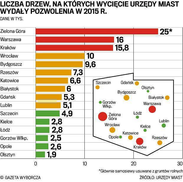 Wrocławska Fundacja Ekorozwoju sporządziła raport "Na straży drzew". Wynika z niego, że w latach 2011-14 w miastach wojewódzkich, wydano pozwolenia na wycięcie 800 tys. sztuk drzew. Porównując tę liczbę do dojrzałe-go lasu, otrzymamy powierzchnię około 2,6 tys. hektarów, czyli obszar zbliżony do połowy rezerwatu ścisłego Białowieskiego Parku Narodowego.